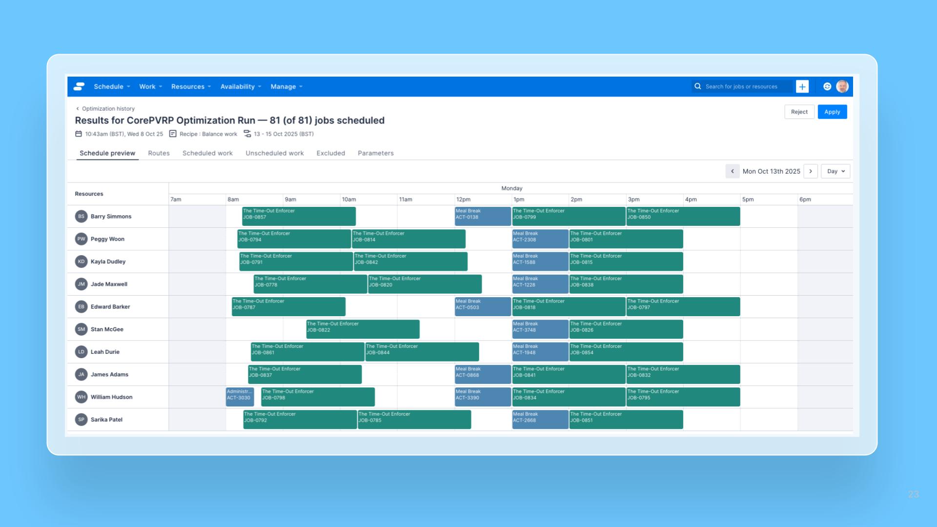 Optimization now treats Activities without addresses as pauses at the resource’s current location, resulting in more accurate and realistic schedules. This update reduces unnecessary travel and improves post-break assignments, helping schedulers and field teams plan their day with greater confidence and efficiency.