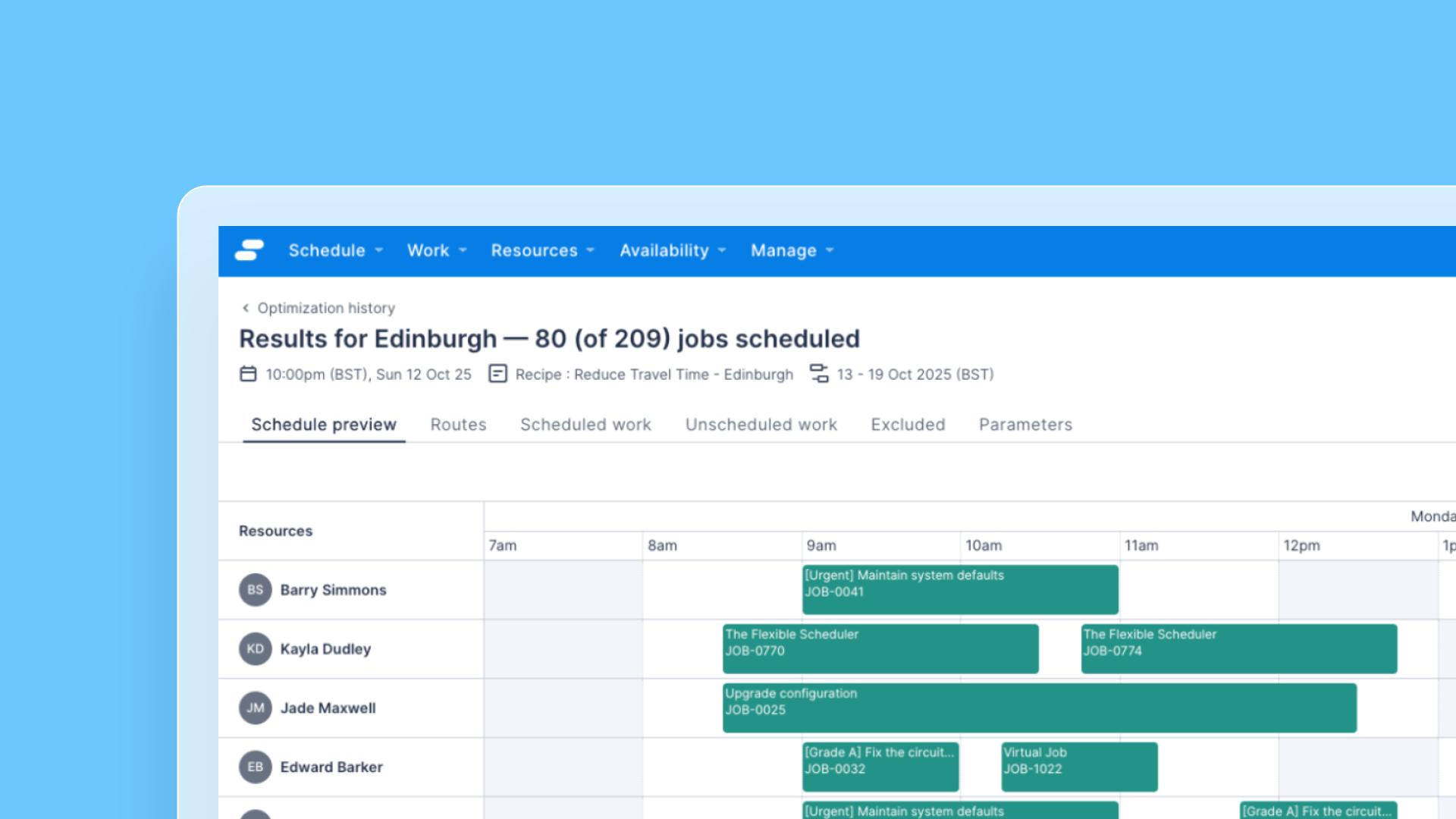 Optimization runs now provide specific, accurate reasons why Jobs could not be assigned to Resources, replacing the previous generic "ran out of availability" fallback that was frequently misleading on complex schedules. When multiple reasons apply to the same Job, they are now reported in a consistent priority order, surfacing the most relevant reason first.