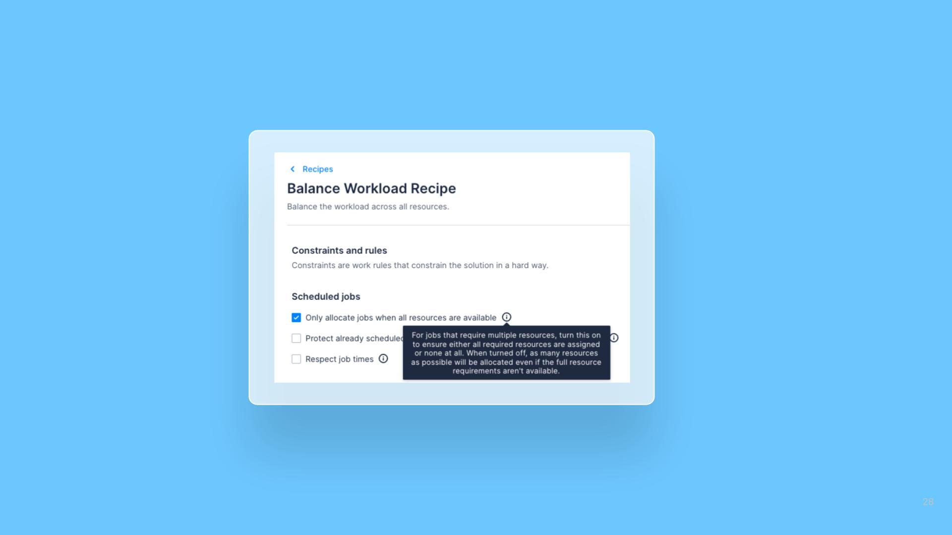Optimization Recipes now include an option to control whether Jobs that require multiple resources can be partially allocated during an optimization run. When partial allocations are disabled, the optimizer will only schedule Jobs that can be fully staffed, ensuring every Job in the schedule has all required Resources assigned.