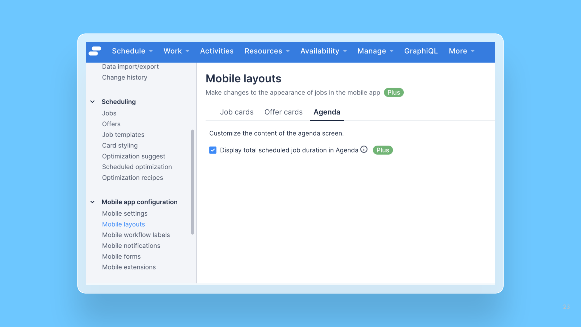 Skedulo admins can now control the display of the total time scheduled for work in the Skedulo Plus Agenda. The setting is enabled by default and can be changed in Mobile settings > Mobile layouts > Agenda > Display total scheduled job duration in Agenda.